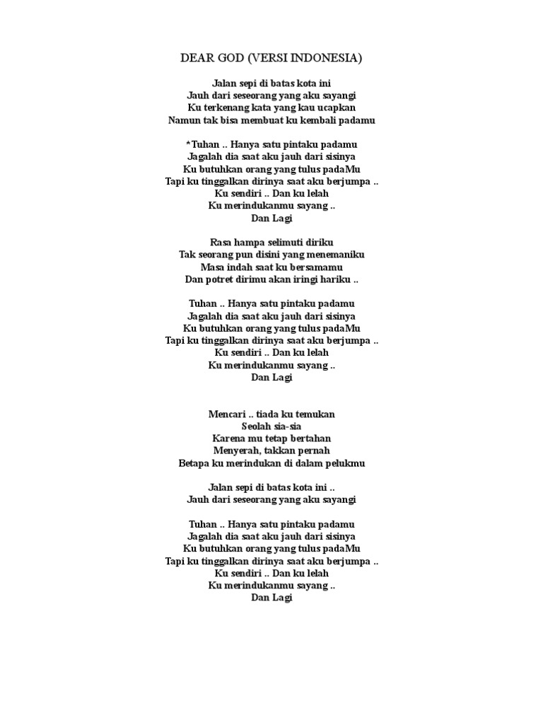 Satu pintaku kepadamu Jangan pernah dua kan aku Namun bila kau tak begitu. Lagu Dear God versi asli yang dibawakan Avenged Sevenfold dirilis pada tahun 2007. Terimalah Pintaku dan Ampunilah Semua.